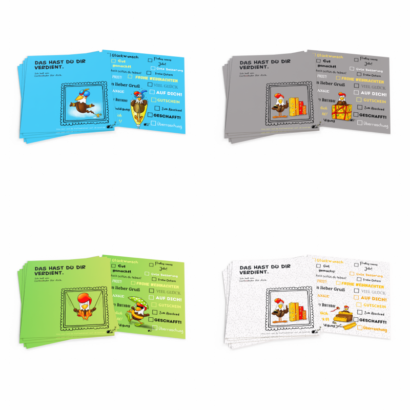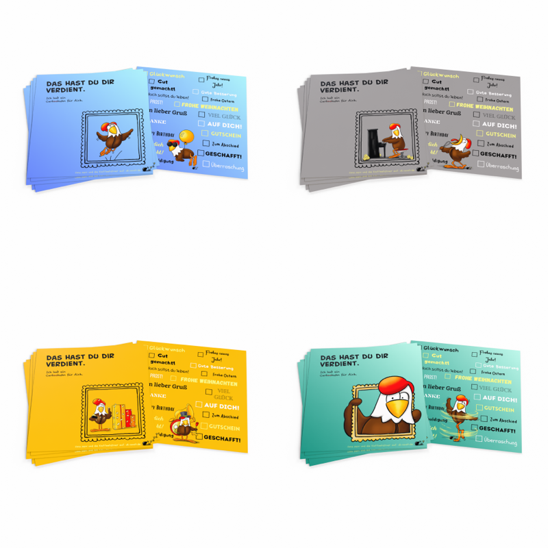 Set mit 4 Postkarten groß 14,8×14,8 cm, 0,54 starker  Chromokarton, beidseitig bedruckt und veredelt mit mattem Finish
